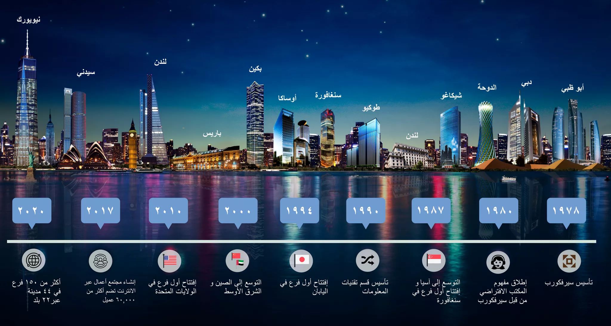 تأسست سيرفكورب في عام ١٩٧٨ في أستراليا على يد ألفريد ج. مفرّج )الرئيس التنفيذي(. على مدى أكثر من ٤٥ عامًا، كان مفرّج رائدًا في هندسة قطاع المكاتب المجهزة والمكاتب الافتراضية، حيث قاد مسيرة تطوير مساحات العمل المرنة. ومن الجدير بالذكر أن سيرفكورب هي المكان الذي وُلدت فيه فكرة المكتب الافتراضي قبل أكثر من ٣٠ عامًا. أصبحت الشركة عالمية في عام ١٩٨٧، وهي تمتلك الآن أكثر من ١٥٠ موقعًا في أكثر من ٤٠ مدينة و١٩ دولة حول العالم.
